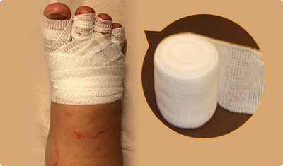 ゆびも圧迫しなければ、ゆびだけがむくんでしまうため、多層包帯法の一番初めに巻きます。4~8cm幅の包帯を縦に二つ折りにして使います。足の場合、足の甲のゆび寄りの部分から巻きはじめ、第1趾(おやゆび)、第2趾、第3趾、第4趾まで順番に2~3回ずつ巻いてください。手の場合、手首から巻きはじめて、拇指、示指、中指、環指、小指の順に巻きます。